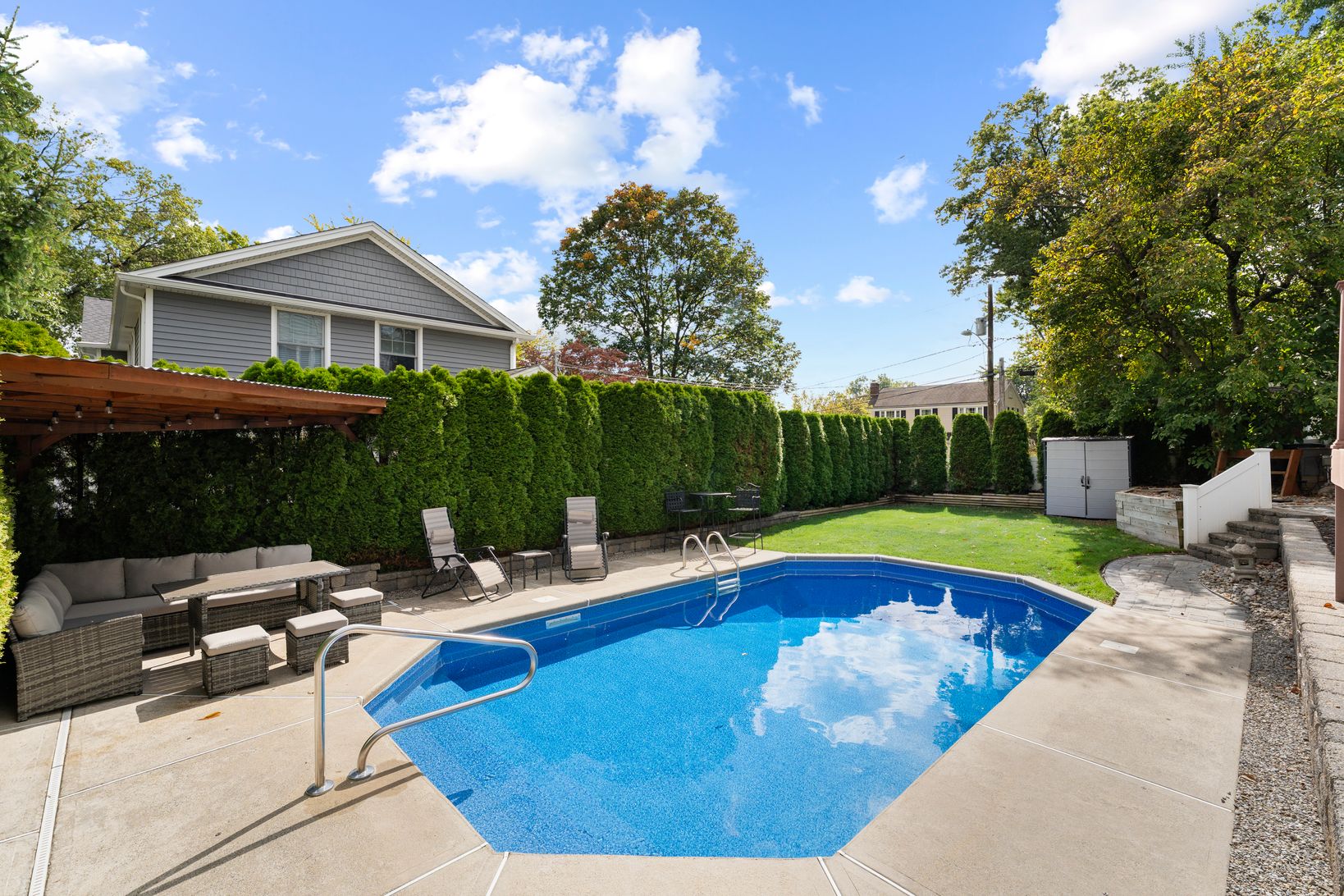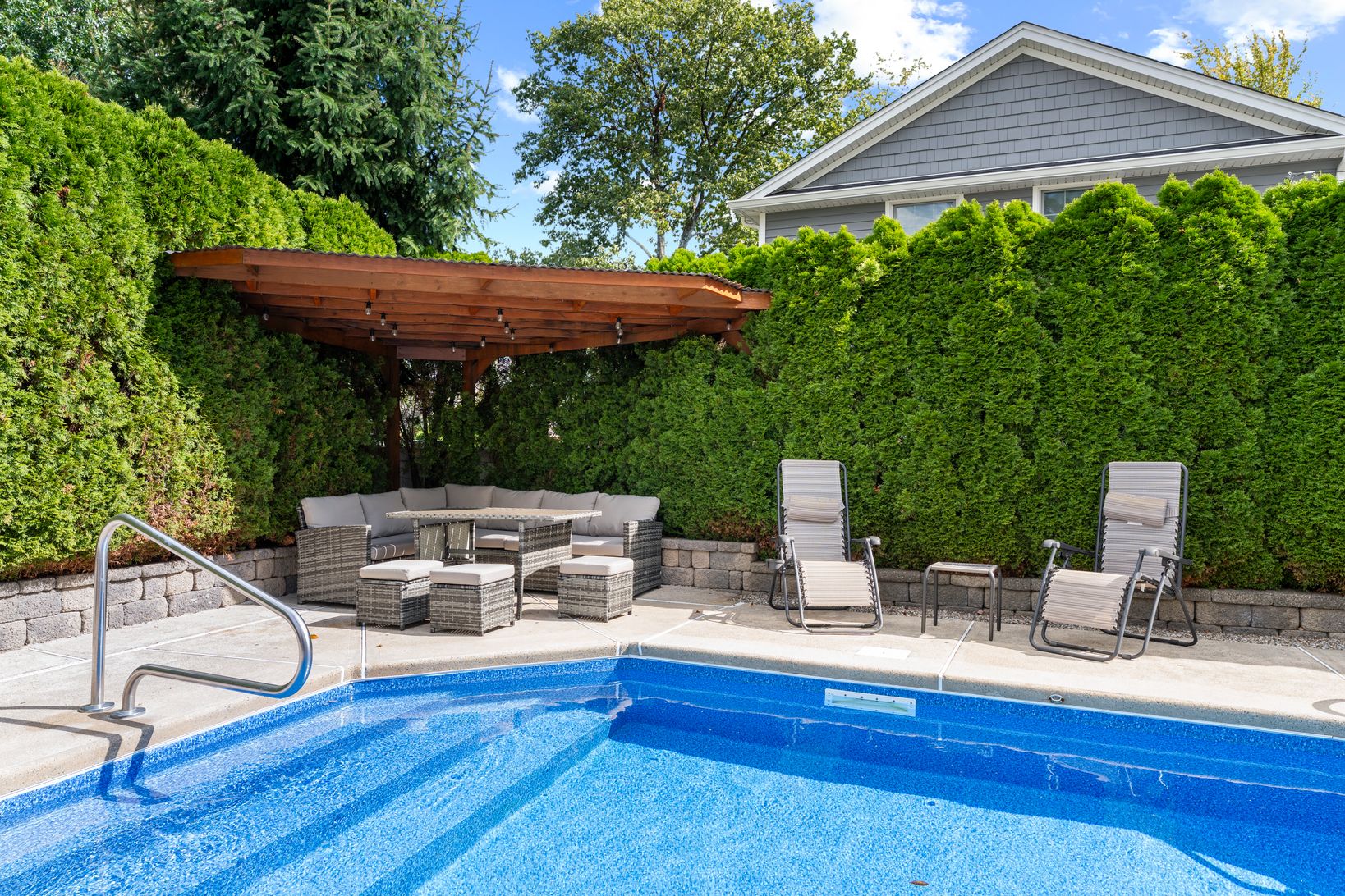 Outdoor Living That Lasts: Beyond the pool, the yard has green space for play, a deck off the kitchen for grill nights, and privacy plantings that keep it peaceful.